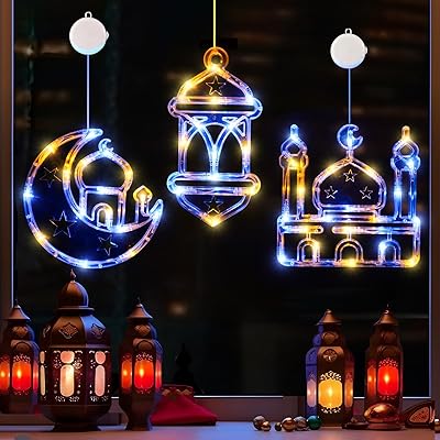 LOLStar Ramadan Decorations, 3 Pack Blue and Warm White Lantern, Moon, Mosque Eid Mubarak Window Lights Battery Operated Hanging LED Lights with Timer & Slow Fade Mode, Perfect Decor for Eid al Fitr